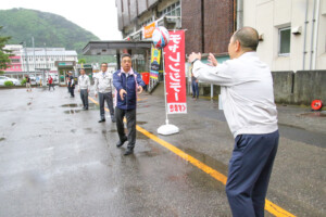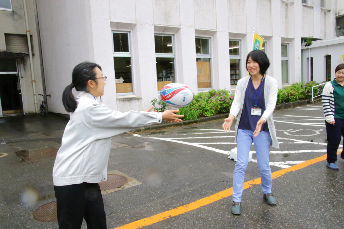 あいにくの悪天候ではありましたが、午前8時から葛巻町役場前ではラグビーボールパスリレーが開催され、ラグビーワールドカップ2019™盛り上げのため、役場職員と地元住民が大きな円を作りラグビーボールをパスしていきました。パスリレーは15分以上行われたため、チャレンジデーのカウント対象になっています。