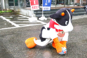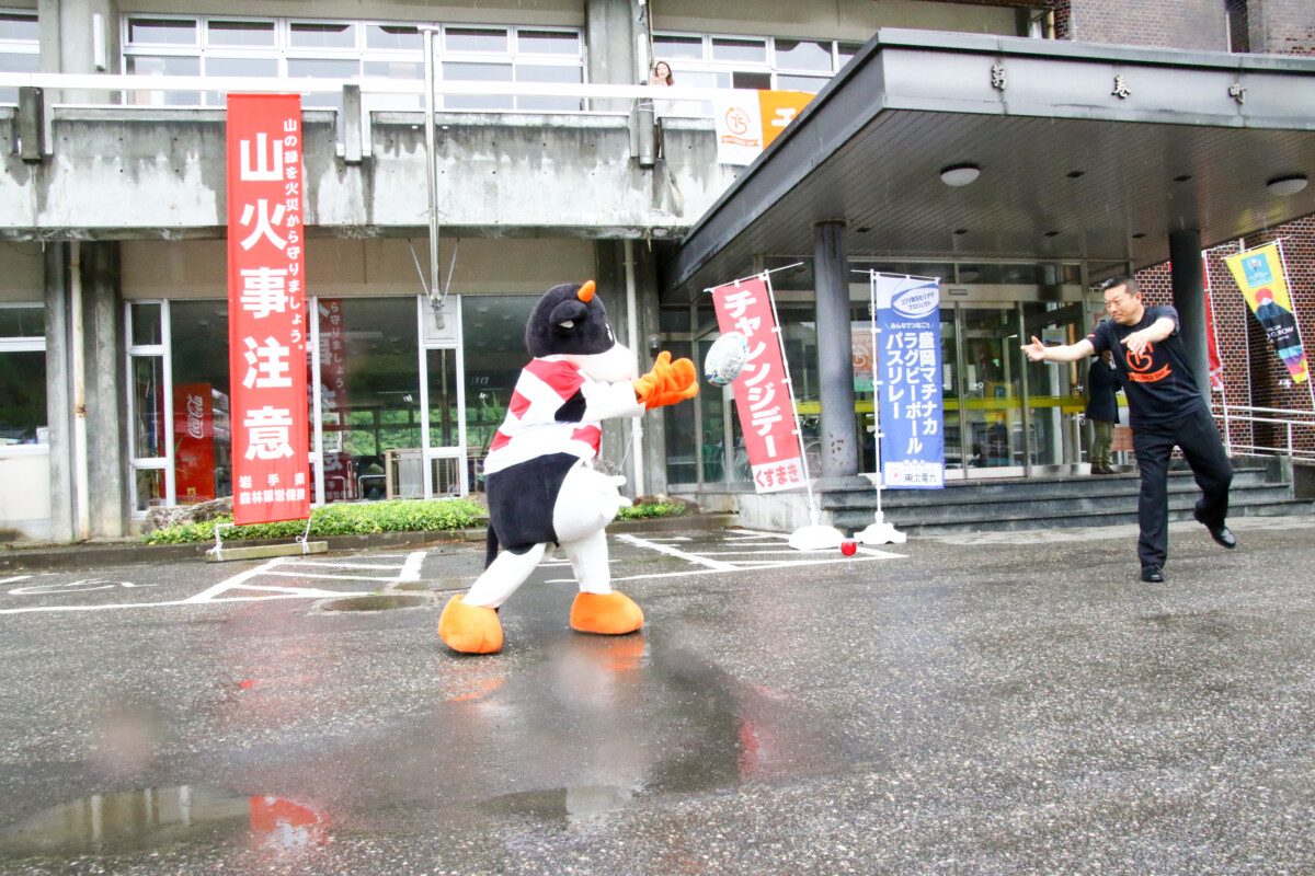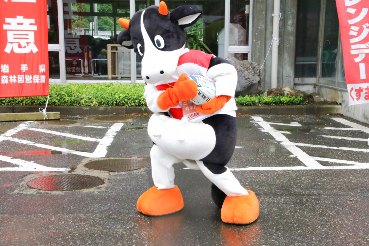 昨年10月に盛岡市で行われた盛岡マチナカラグビーボールパスリレーでパスをつないだラグビーボールも、葛巻町で新たにパスをつなぎ、葛巻町のキャラクターである「ミルンちゃん」が町長からパスを受け取りトライを決めました。