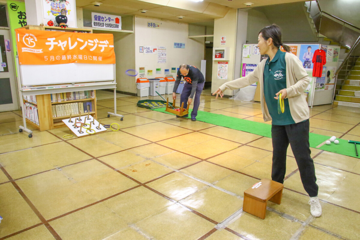 葛巻役場内では、輪投げと、硬いボールをスティックで打って得点の書かれたゴールを狙うスカットボールが行われ、役場に来た方々が簡単にチャレンジデーに参加できるように工夫されていました。