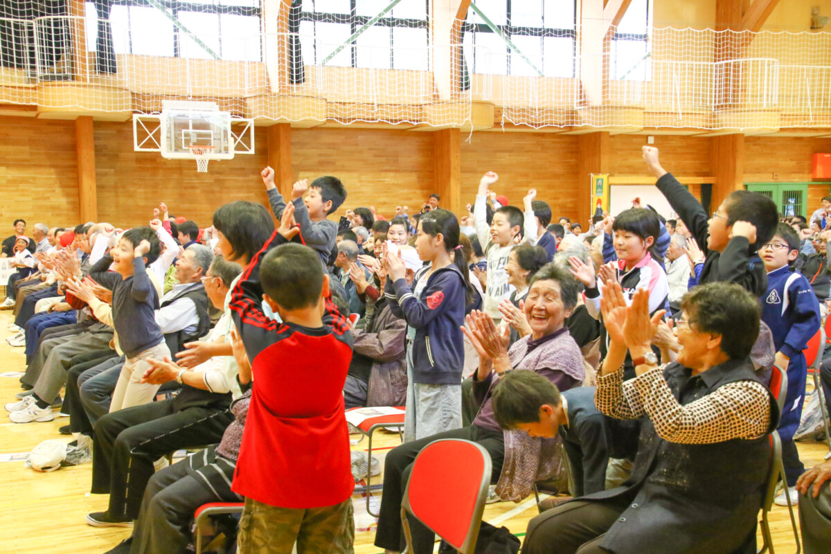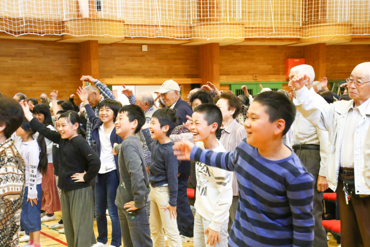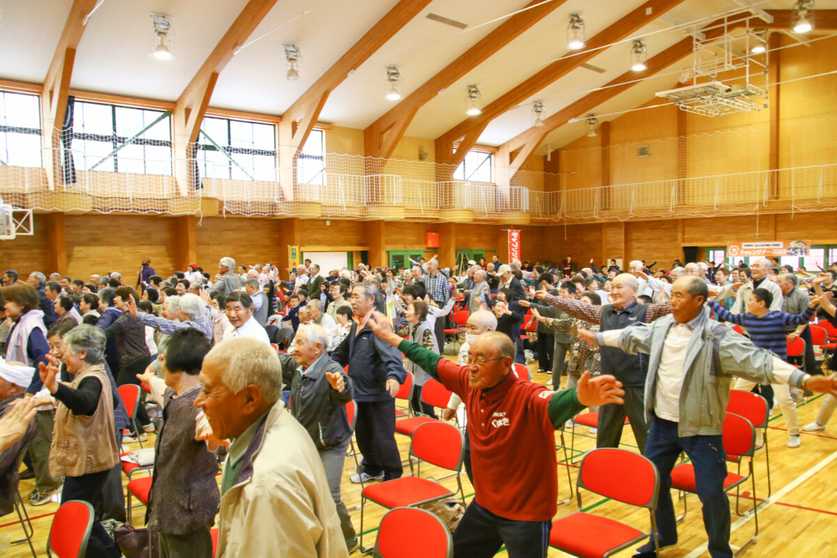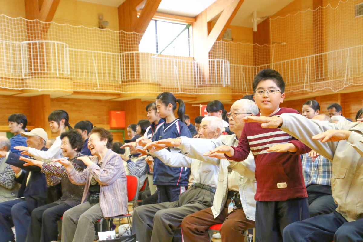 また葛巻小学校体育館ではチャレンジデーに合わせて、町民まなびぃ学園総合開講式と、葛巻福祉大学開講式が開催され、地元のシニアの方々と葛巻小学校の生徒たちが一緒に軽体操とレクリエーションを行いました。