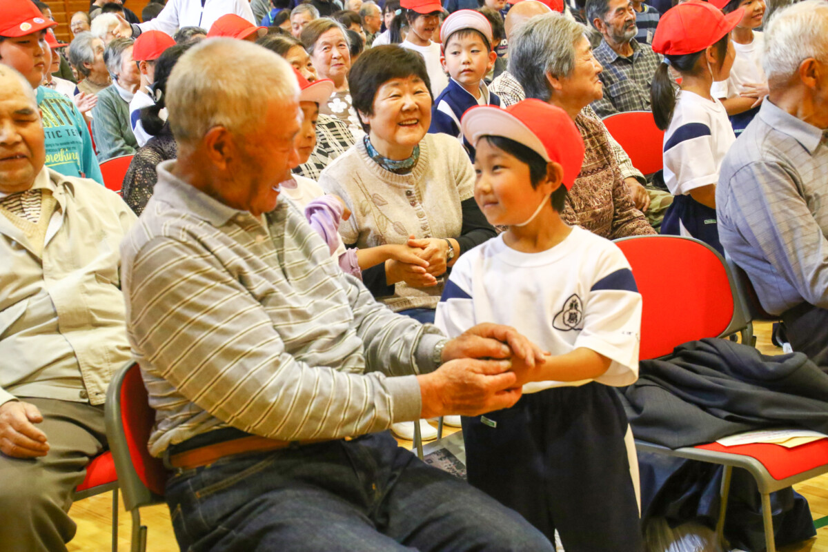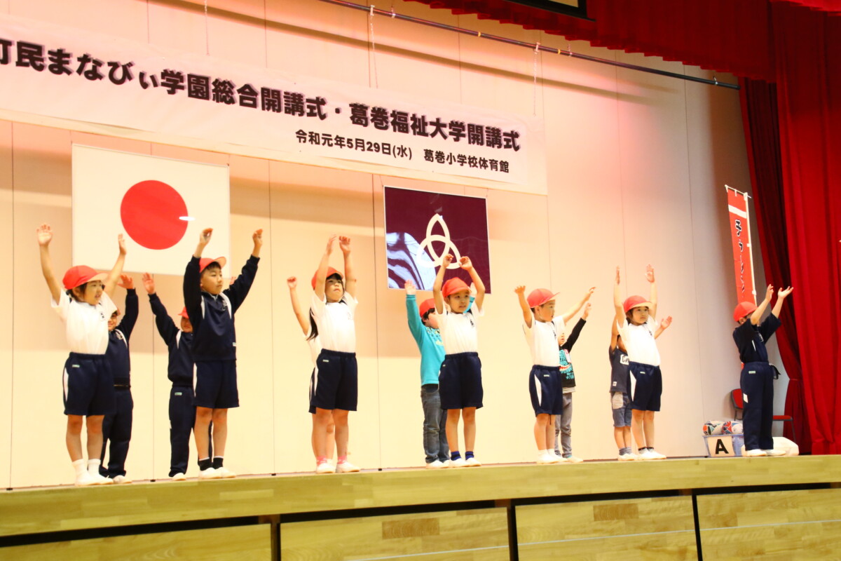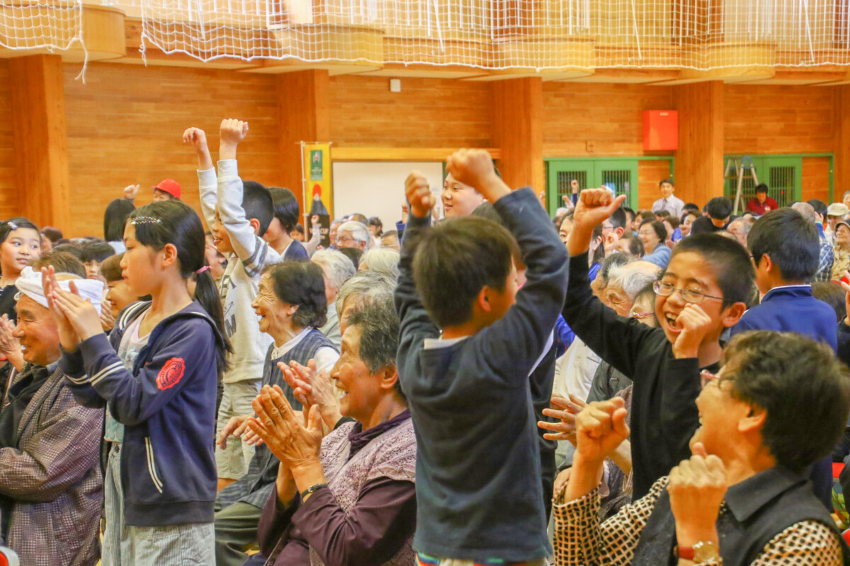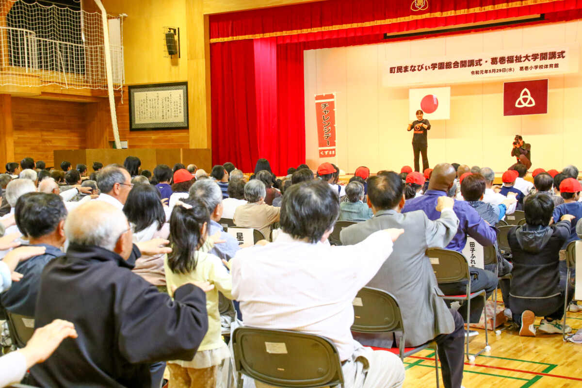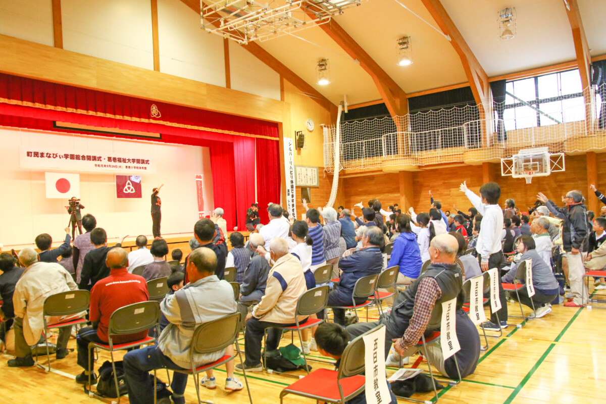 また葛巻小学校体育館ではチャレンジデーに合わせて、町民まなびぃ学園総合開講式と、葛巻福祉大学開講式が開催され、地元のシニアの方々と葛巻小学校の生徒たちが一緒に軽体操とレクリエーションを行いました。