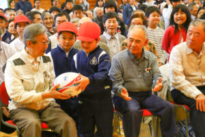 葛巻小学校でもパスリレーが行われ、子供と大人が交互に楽しそうな様子でパスをつないでいきました。レクリエーション後には「シルバーリハビリ体操でますます元気に!」というテーマで健康講座も開催されました。