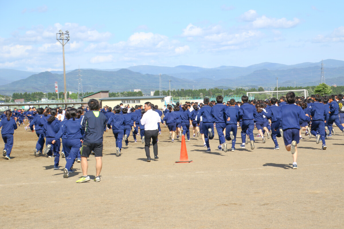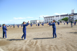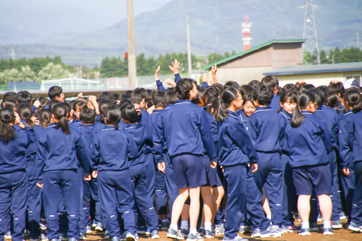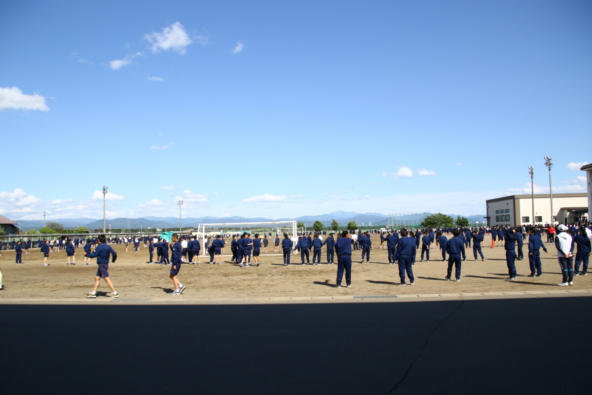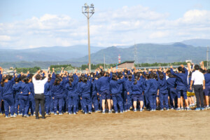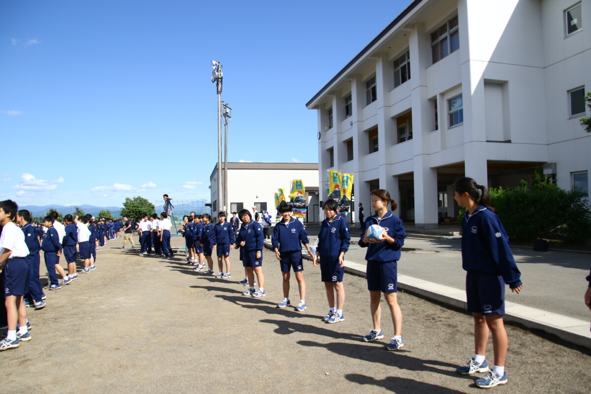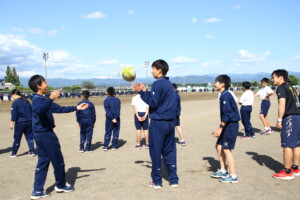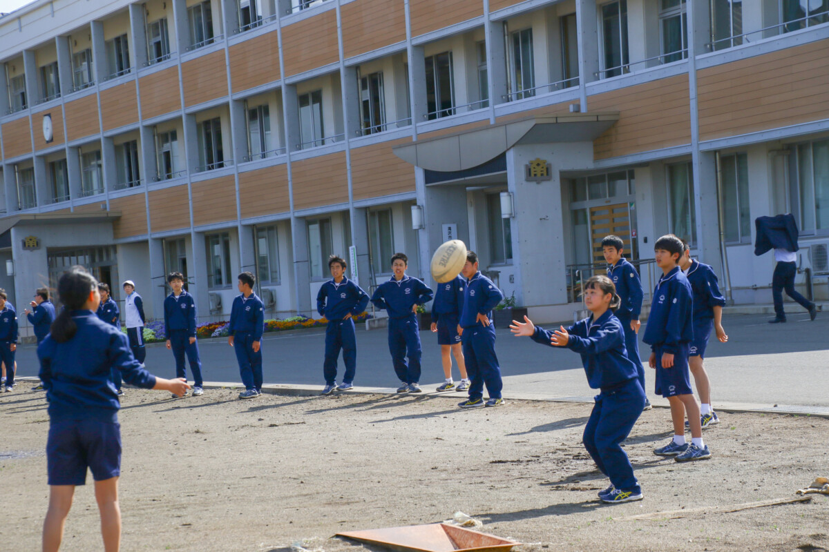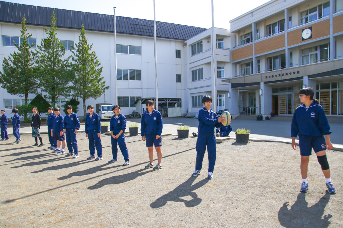 滝沢市立滝沢南中学校では、14時40分から全校生徒参加のラグビーボール・パスリレーが開催され、724人の学生と教員がグラウンドに大きな円を描くように並びラグビーボールを回していきました。パスを強く投げたり高く投げ上げたり隣の人が取りやすいように優しく投げたりと、人によってパスに個性がでるパスリレーでしたが、みんな笑顔で楽しそうに声をあげながらパスを回していました。