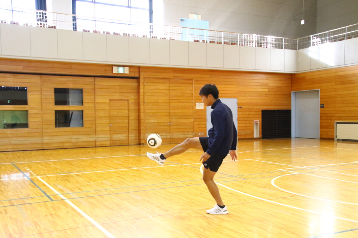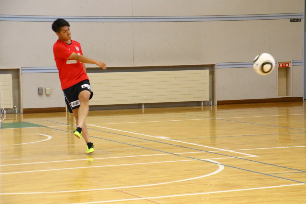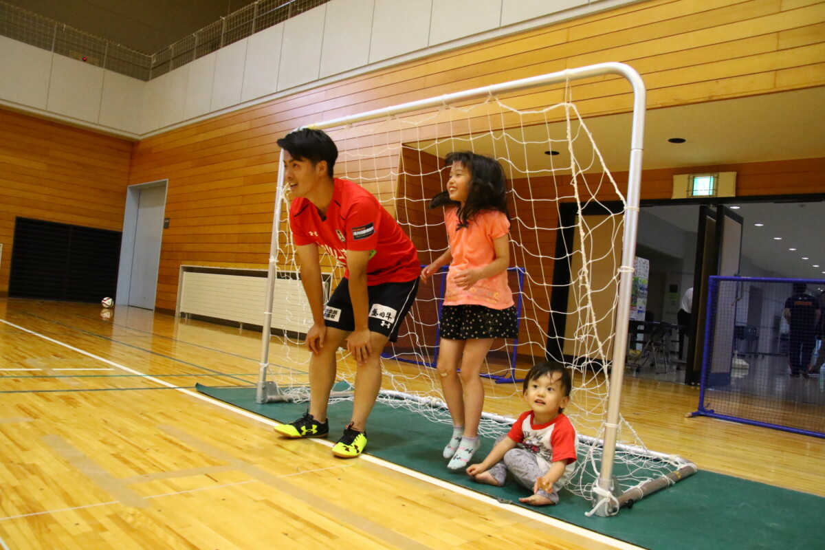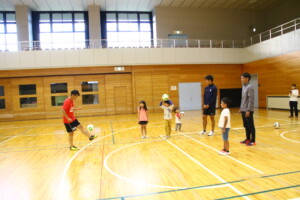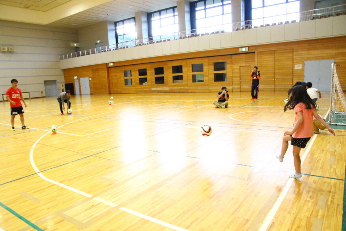 いわてグルージャ盛岡によるフットサル体験教室に参加した子供たちは、少し離れたところに置いた的(ボール)に蹴ったボールを当てられるかに挑戦していました。なかなか当てることのできなかった一番離れた的にうまく当てられたときはみんなが拍手をして喜びました。