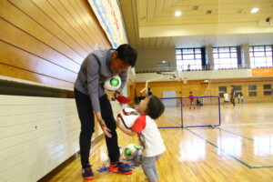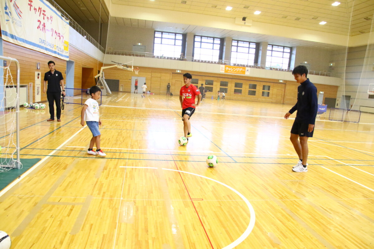 滝沢総合運動公園アリーナでは、17:00から19:00までプロサッカーチームのいわてグルージャ盛岡によるフットサル体験教室、プロバスケットボールチームの岩手ビッグブルズによるバスケットボール体験教室が行われました。岩手県のプロスポーツ2チームが同じ体育館でハーフコートずつ同時に体験教室を行うのは大変珍しく、現役選手に直接ボールの扱い方を教えてもらえる貴重な体験教室でした。