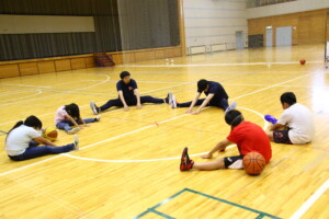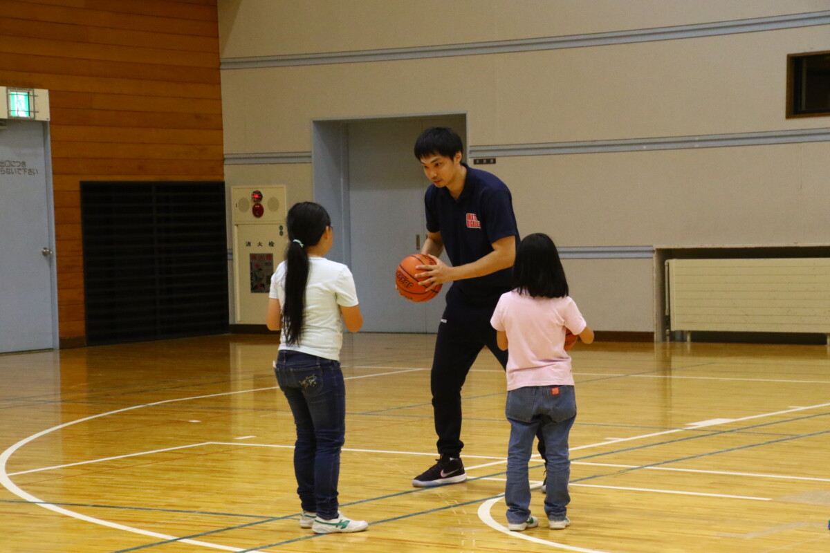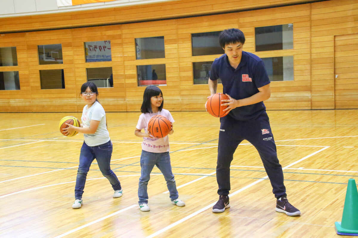 岩手ビッグブルズによるバスケットボール体験教室では、選手がブロックしているところをうまく潜り抜けてシュートを打つ挑戦をしていました。男子グループと女子グループに分かれて、準備体操から投げ方まで教えてもらっていました。
