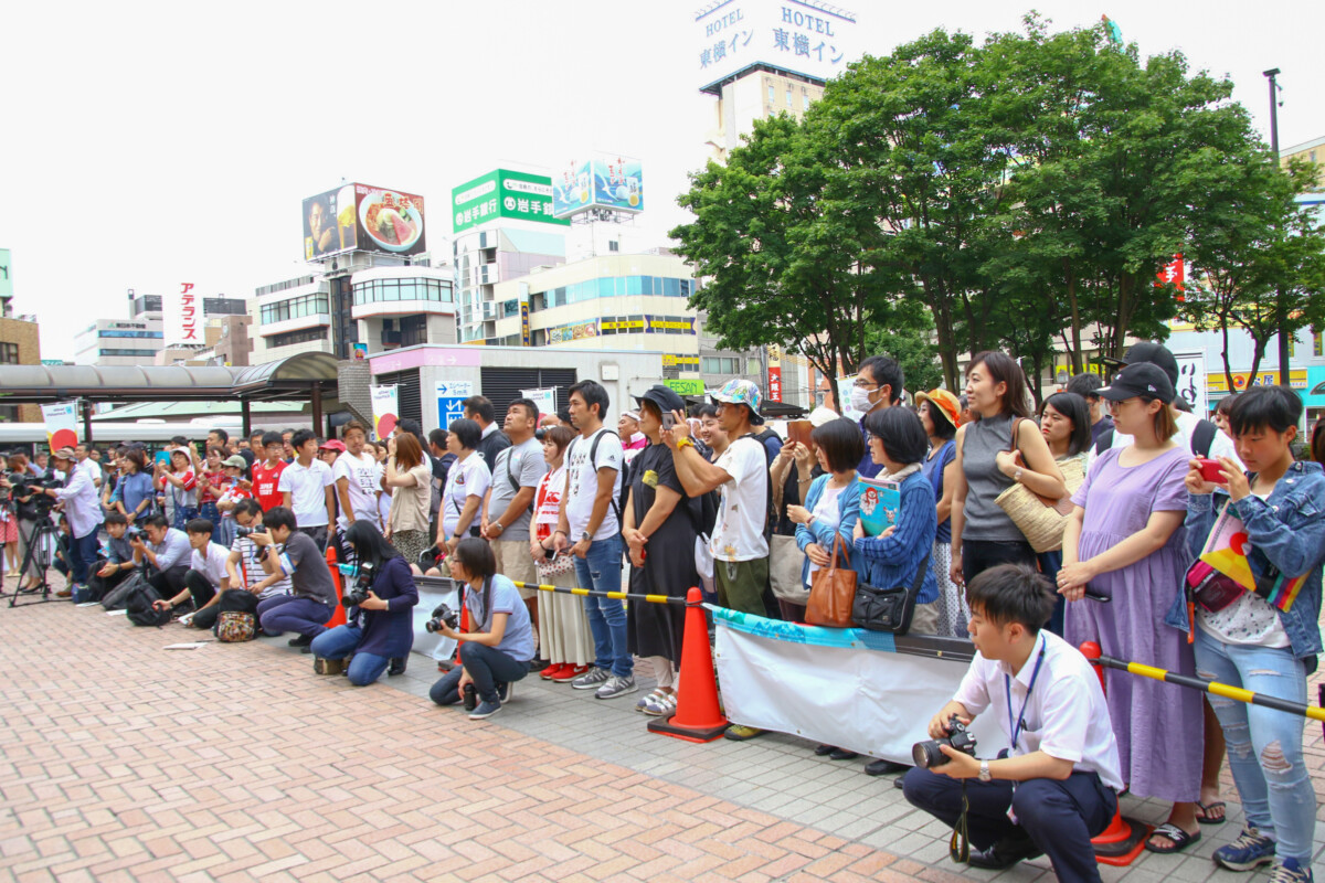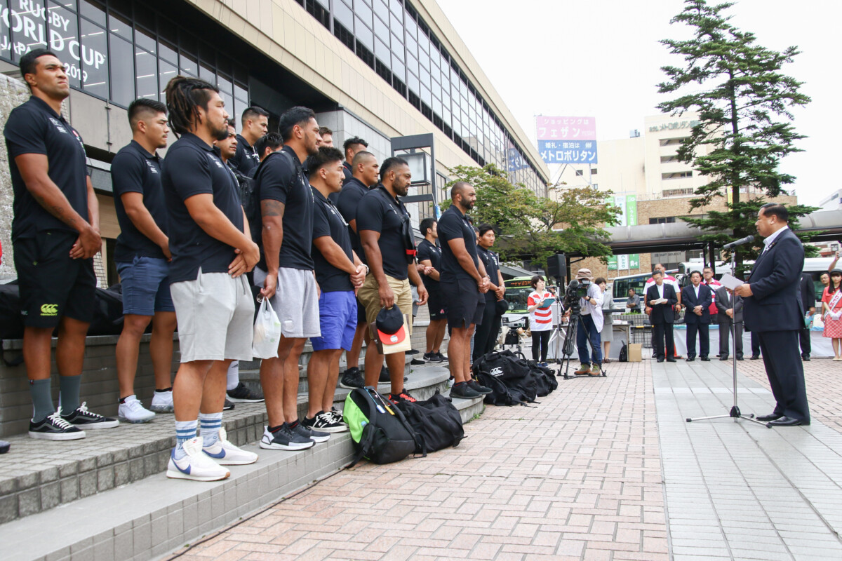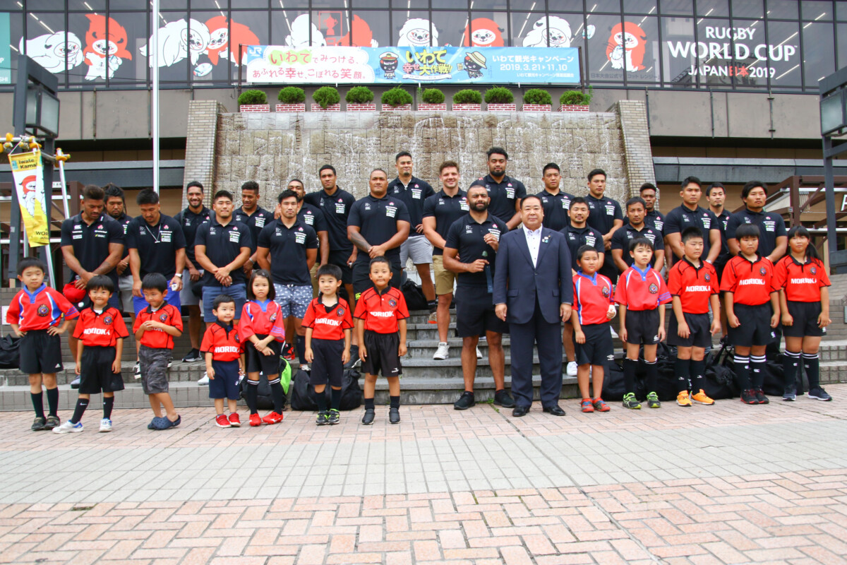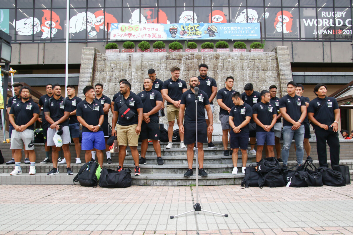 令和元年7月21日、盛岡駅前滝の広場にて、ラグビー日本代表歓迎セレモニーが開催されました。 7月27日(土)に釜石鵜住居復興スタジアムで開催される、パシフィック・ネーションズカップ2019 フィジー代表戦に向けて、ラグビー日本代表が盛岡で事前キャンプを行います。