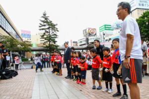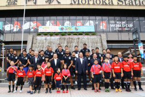 長身で筋骨隆々のたくましい日本代表チームが盛岡駅前に集合し、駆けつけたラグビーファンや観覧者で滝の広場は賑わいをみせていました。 セレモニーでは谷藤裕明盛岡市長が選手たちに歓迎の言葉を贈り、市長とともにラグビースクールの子どもたちが、盛岡市の特産である南部鉄器製の風鈴を手渡しで贈呈しました。