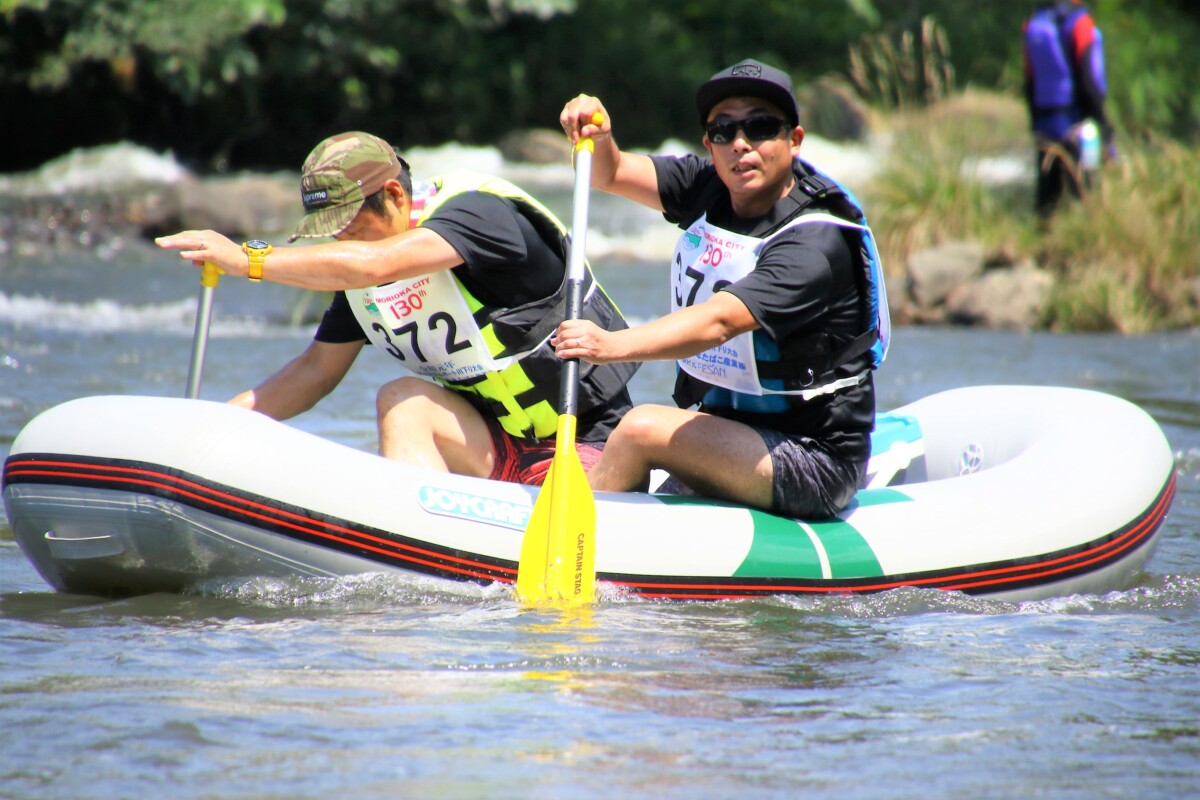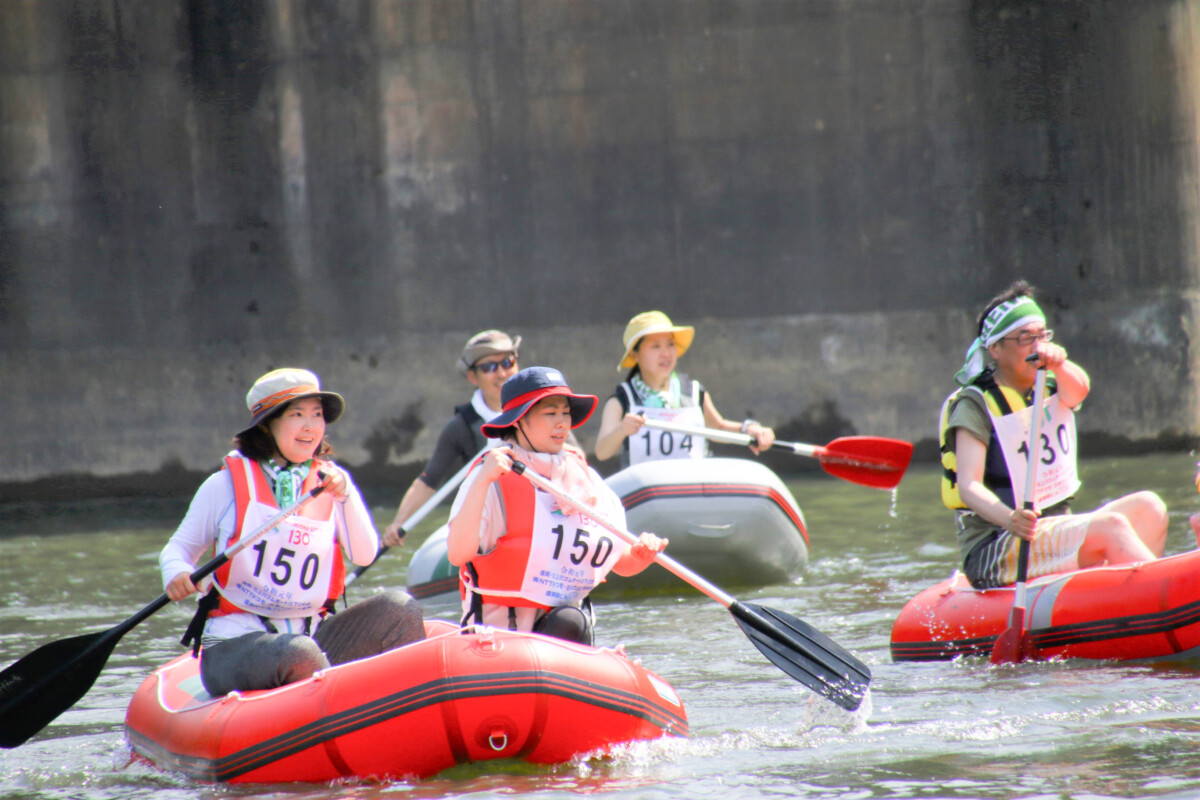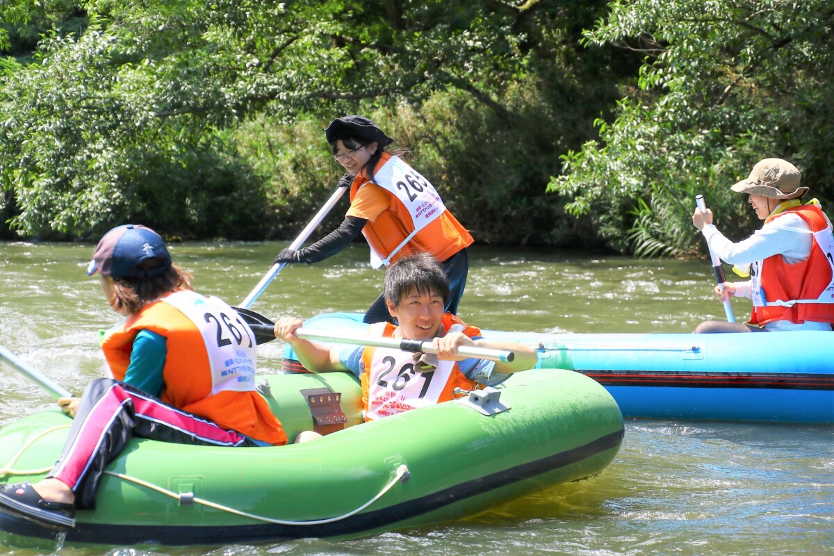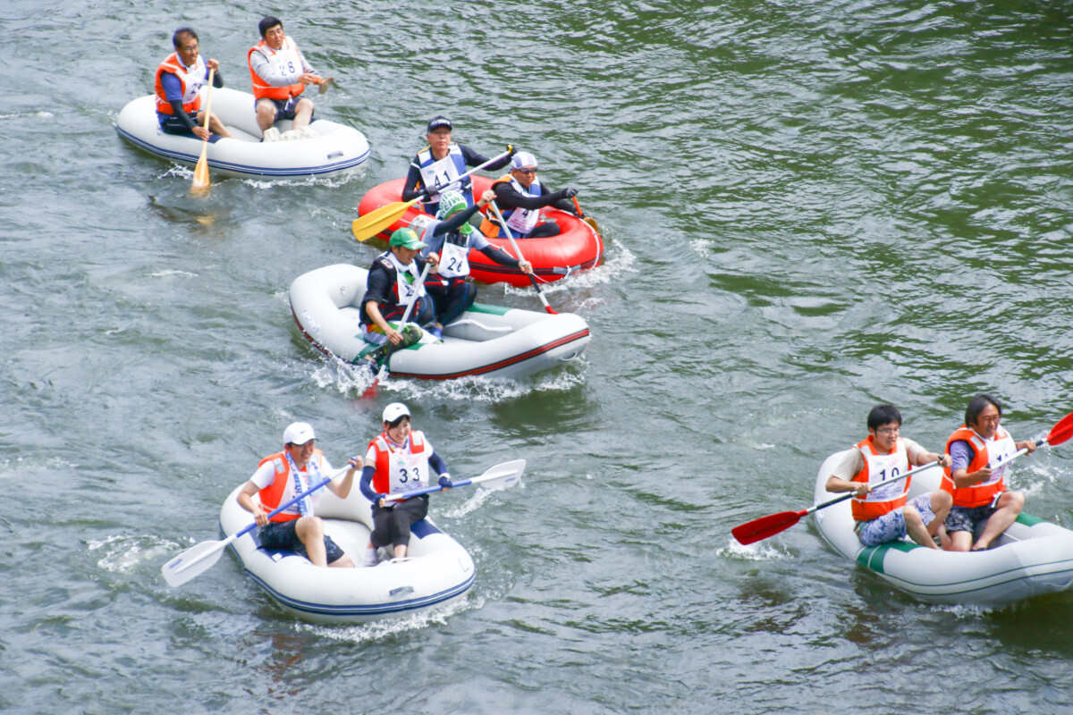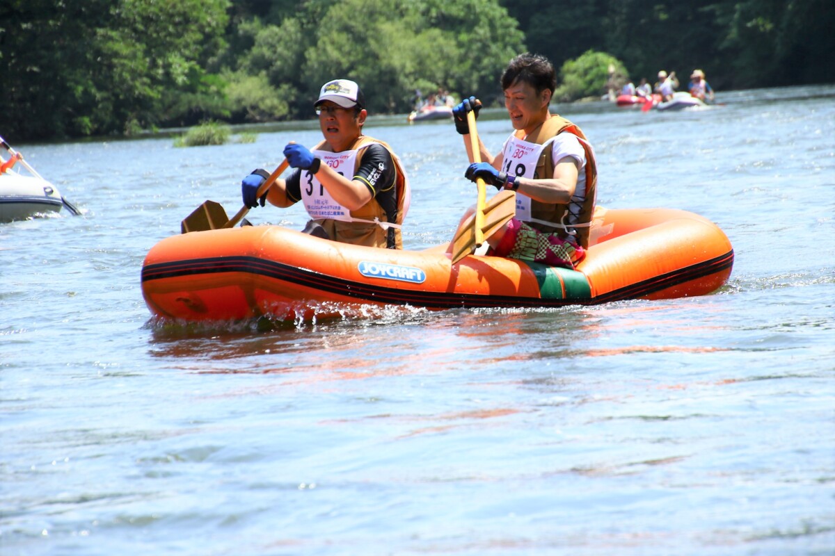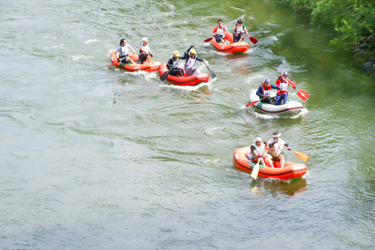 2人1組でゴムボートに乗船し、一分一秒を競い全力で前へ進むチームもあれば、話しながら楽しそうに進むチーム、途中で漕ぐのを休んでゆったり川の流れに身を任せたり、途中で水をかけあって涼んだりするチームもあり、参加者がそれぞれの楽しみ方をしていました。