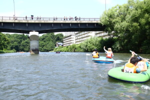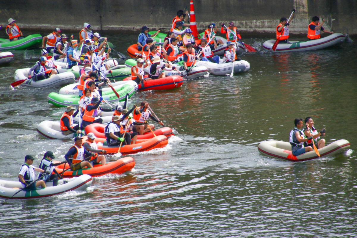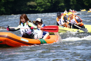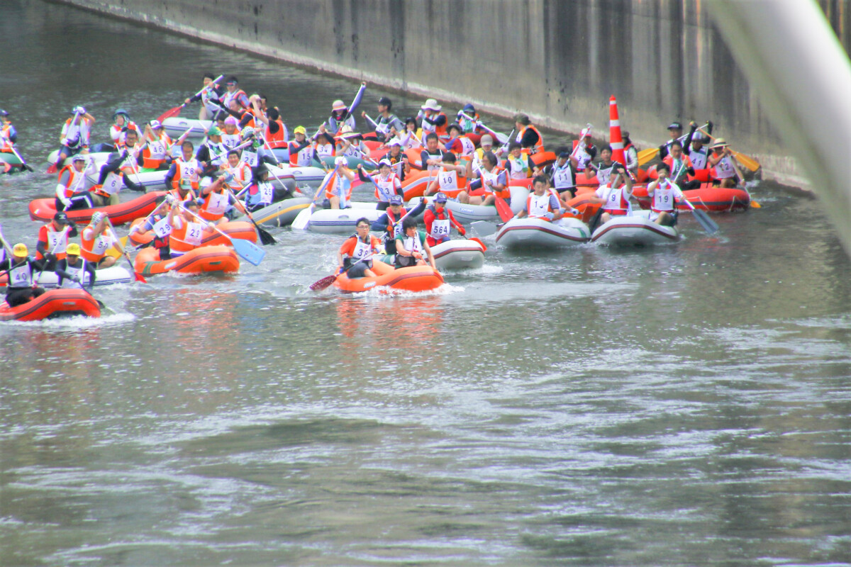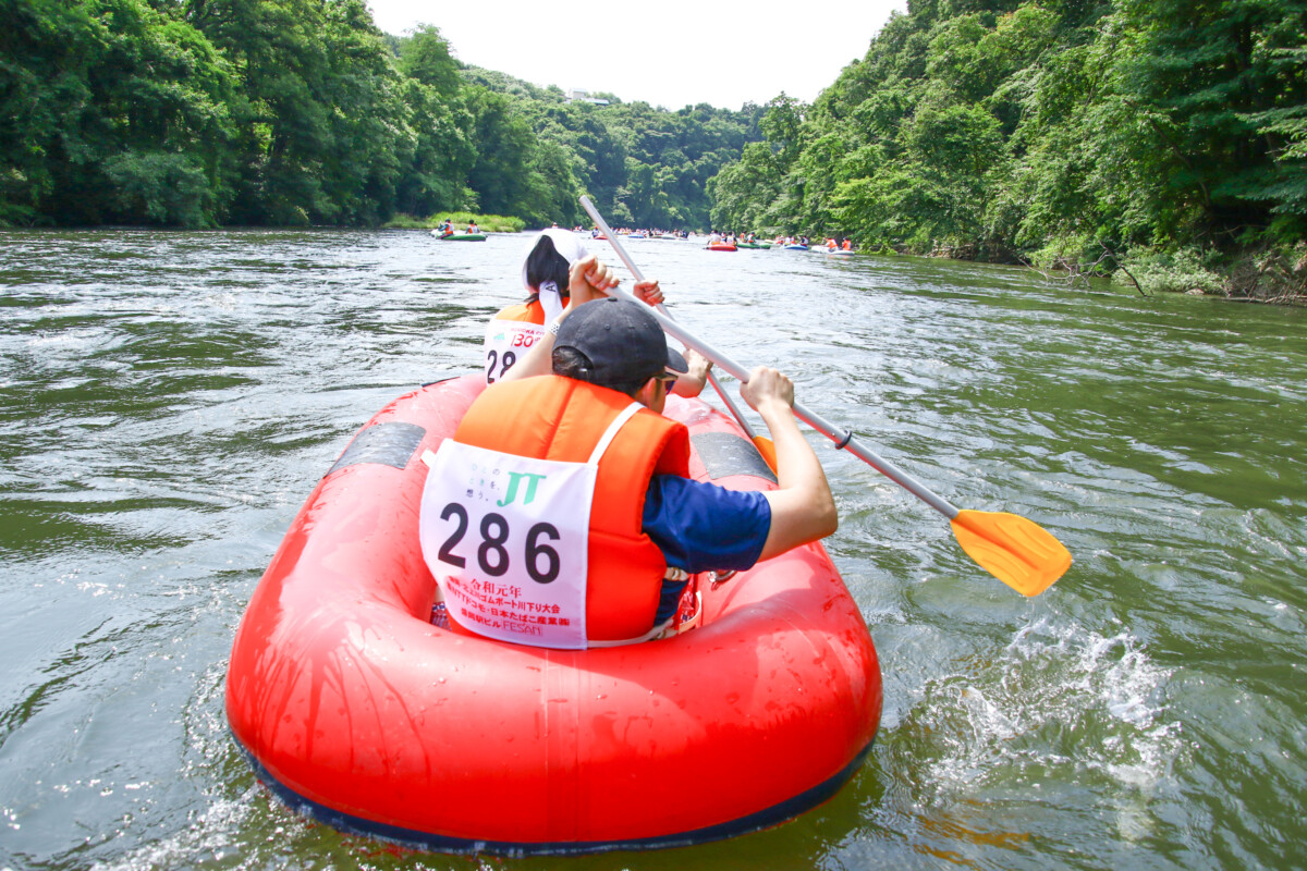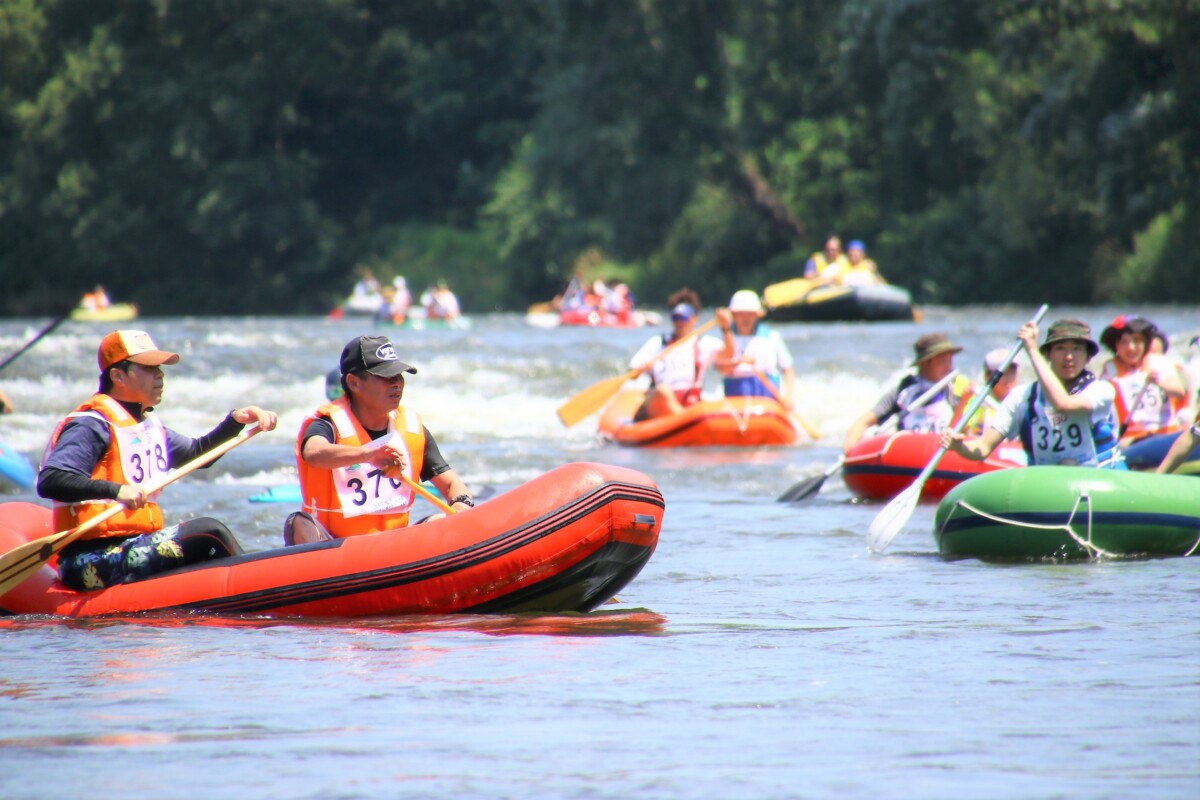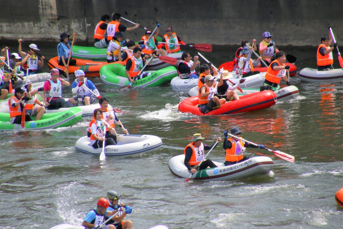 2人1組でゴムボートに乗船し、一分一秒を競い全力で前へ進むチームもあれば、話しながら楽しそうに進むチーム、途中で漕ぐのを休んでゆったり川の流れに身を任せたり、途中で水をかけあって涼んだりするチームもあり、参加者がそれぞれの楽しみ方をしていました。