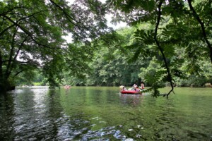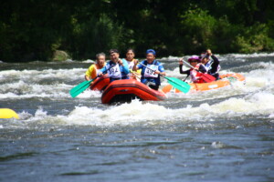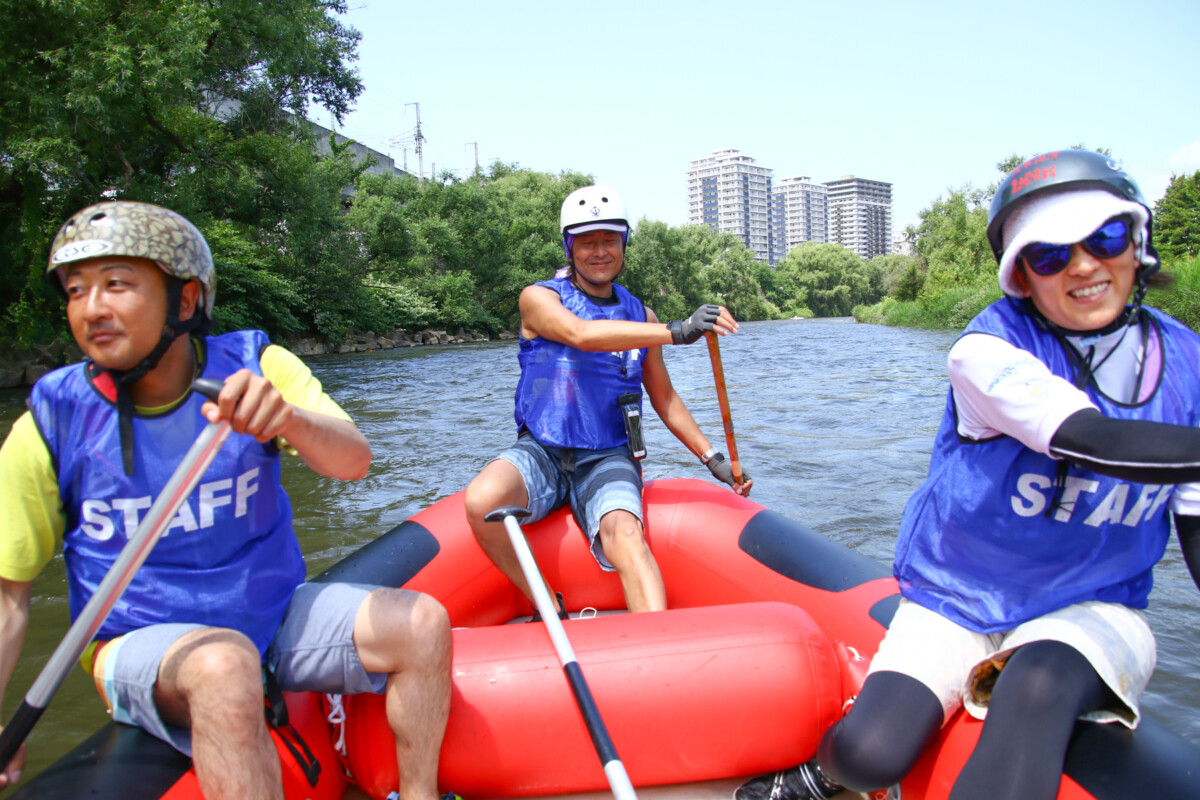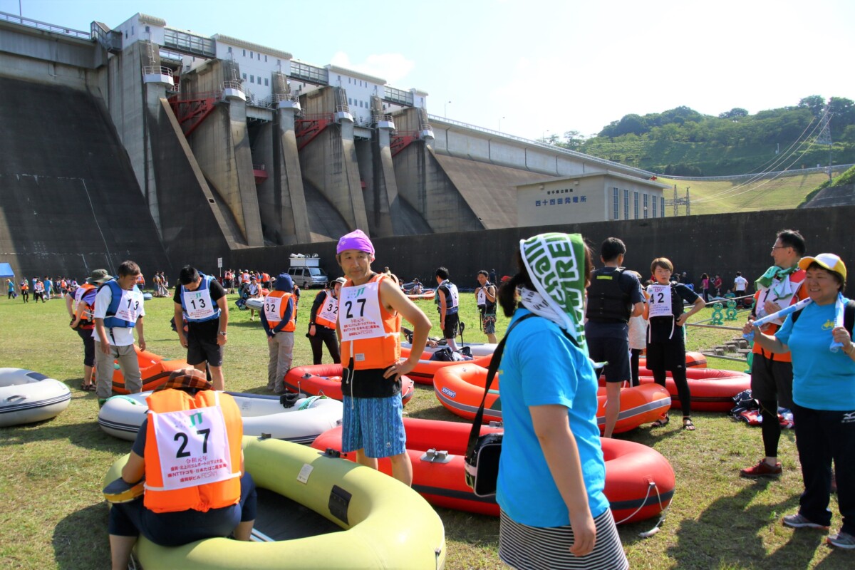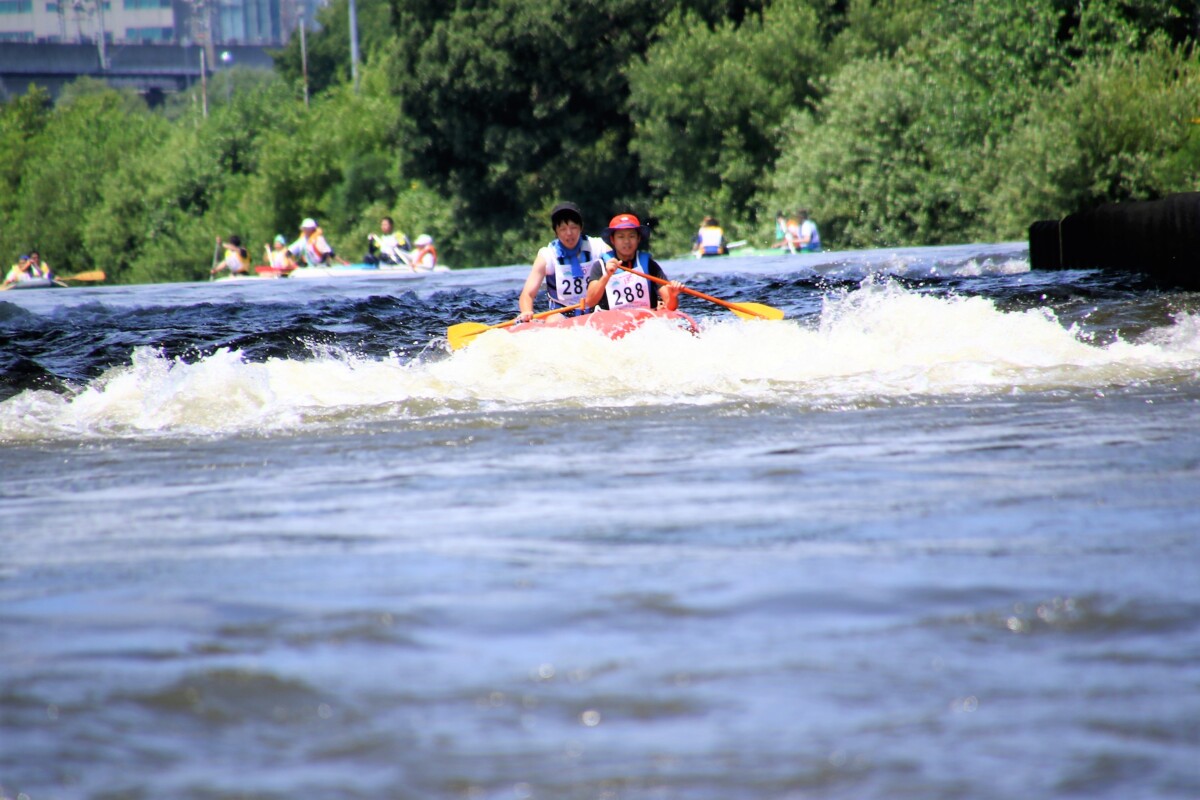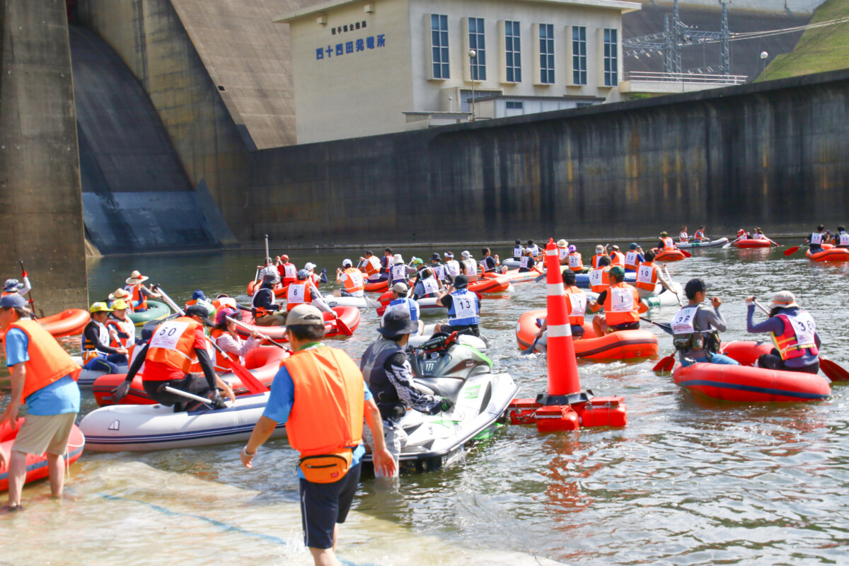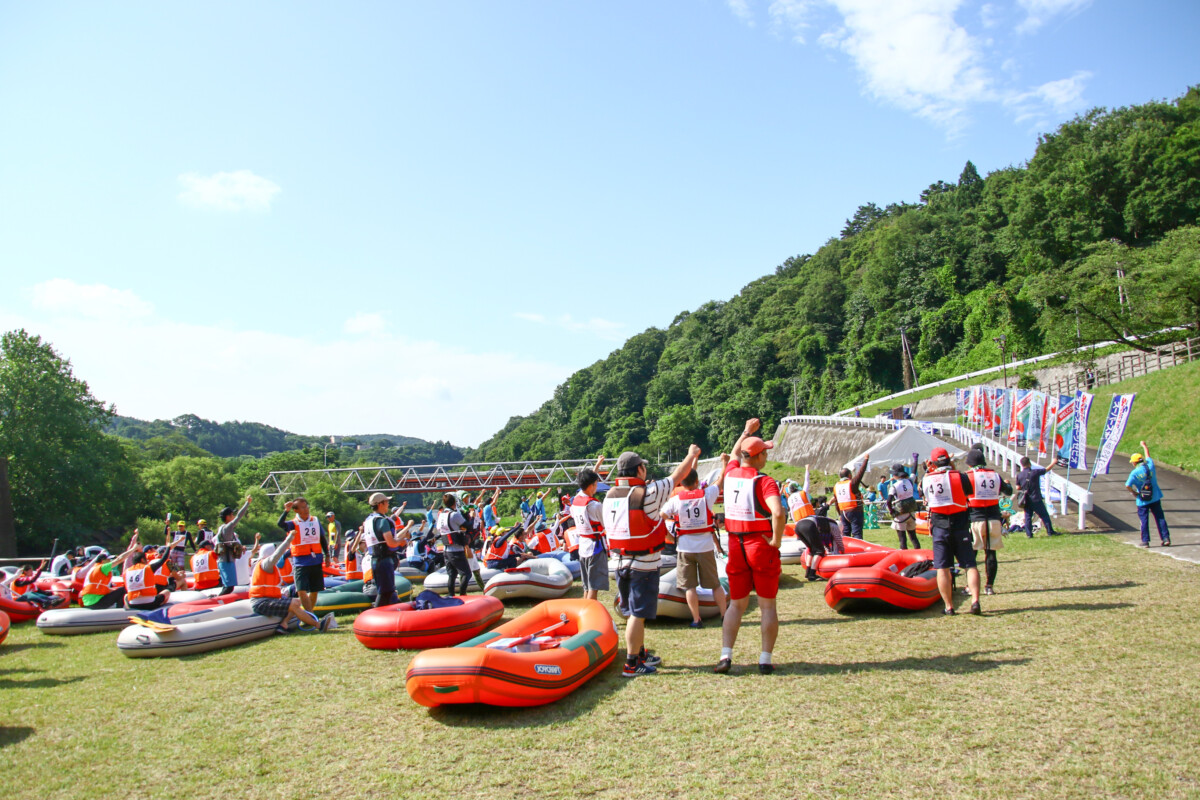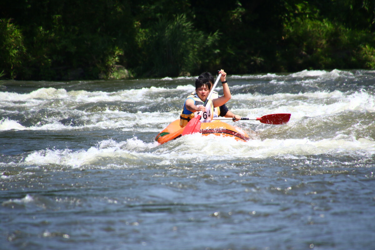 2人1組でゴムボートに乗船し、一分一秒を競い全力で前へ進むチームもあれば、話しながら楽しそうに進むチーム、途中で漕ぐのを休んでゆったり川の流れに身を任せたり、途中で水をかけあって涼んだりするチームもあり、参加者がそれぞれの楽しみ方をしていました。