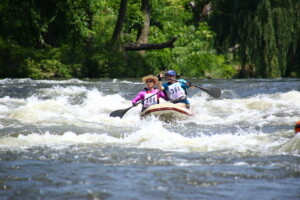 他の場所に比べて落差が高く流れも速い難所の一つである北フォールでは、転覆しないように声をかけ合いうまくボートの角度を調節しながら2人で協力して難所を超えていくチームが多くみられました。難所で水を被るのもまたゴムボート川下り大会の醍醐味で、強い日差しの下で水しぶきがかかるのが逆に心地よく、難所を無事超えた後の参加者は笑顔で次のゴールをめざしていきました。