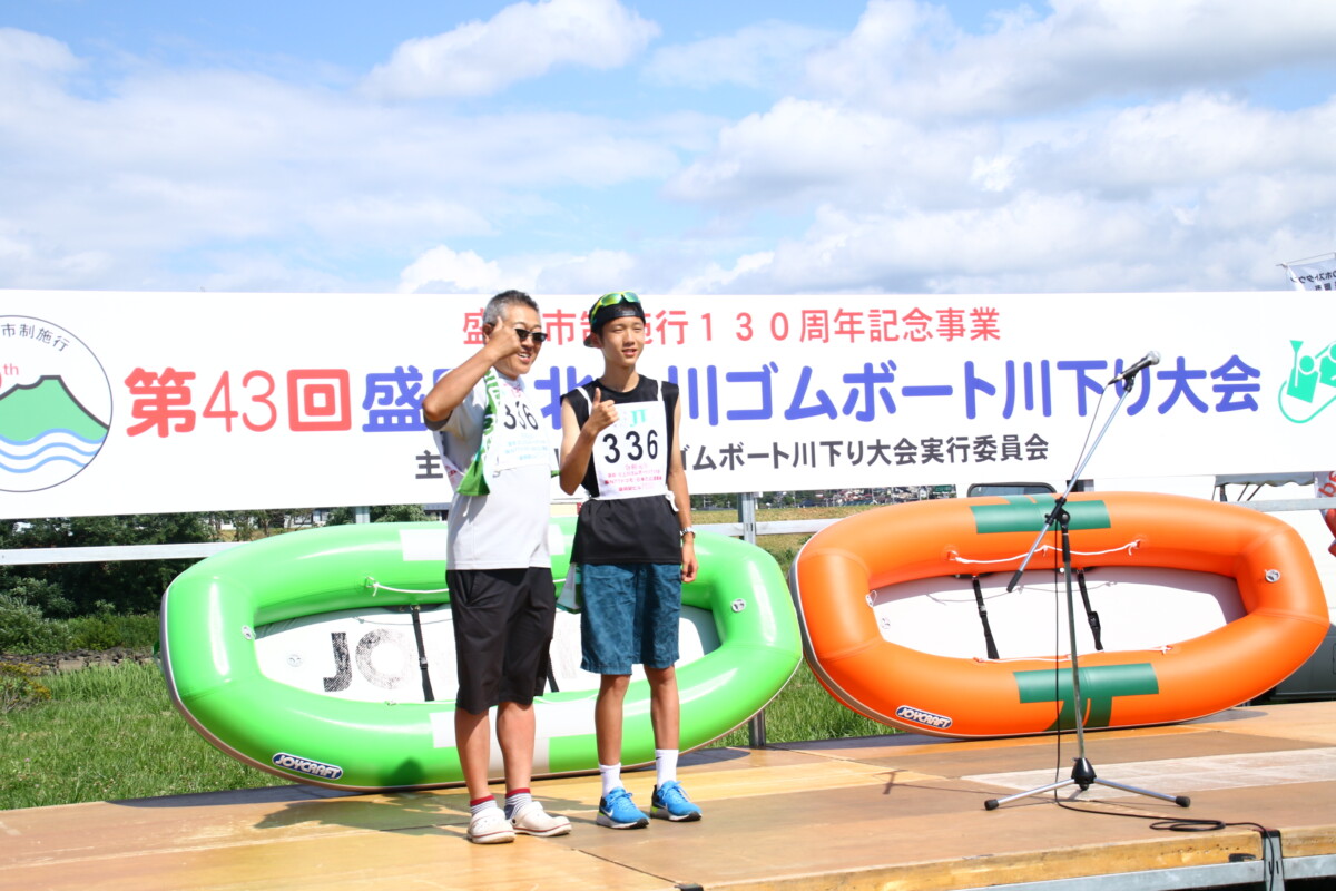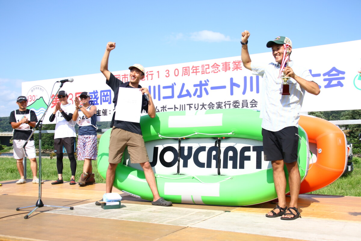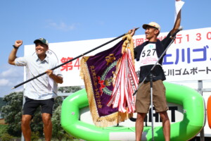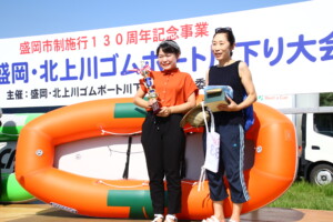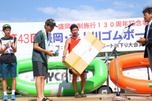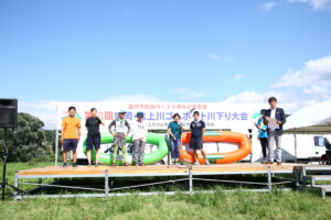 今年の川下り大会のタイムレースは、トップチームが数十秒差の接戦を繰り広げました。上位入賞者にはゴムボートやお米、キャンプ用品などの豪華景品が贈られ、トロフィーとメダルも進呈されました。総合優勝チームには優勝旗も贈呈されました。