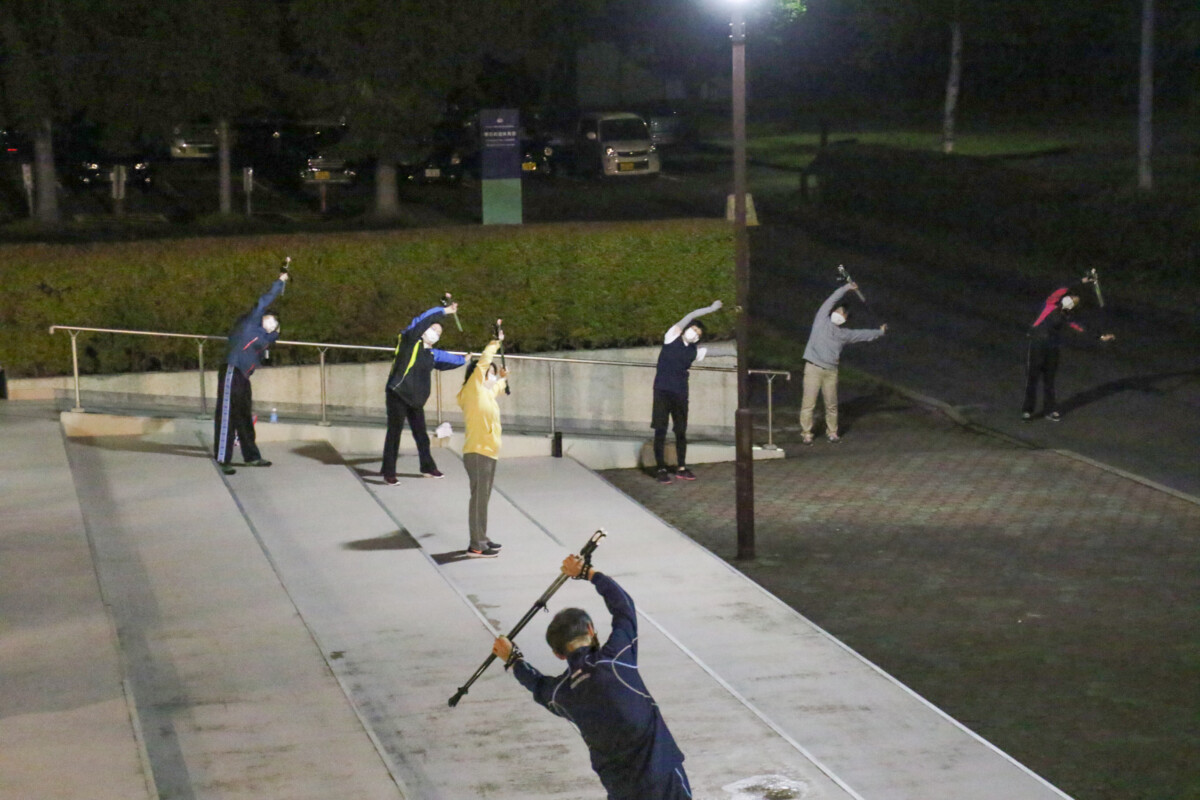 ウォーキング前にはポールを使った準備体操も行われ、普段伸ばしにくい筋肉もポールで身体を支えることで伸ばせるようになります。自然な腕振りの中でポールを使います。腕や肩を使うことによりエネルギー消費量が増加するのもノルディックウォーキングの魅力の一つ。希望者には参加期間中ポールの貸し出しも行われています。