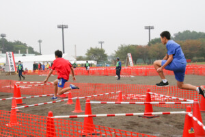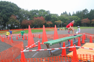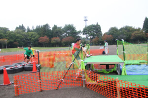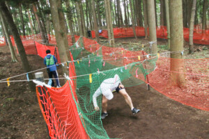 LFX部門は各種目別のタイムレースで、2km、4km、10kmの種目があります。コースは総合運動公園内の林や森の中にも伸び、丸太やロープ、迷路、2way、3wayなど、60種類以上の障害物を越えながら走り抜けます。