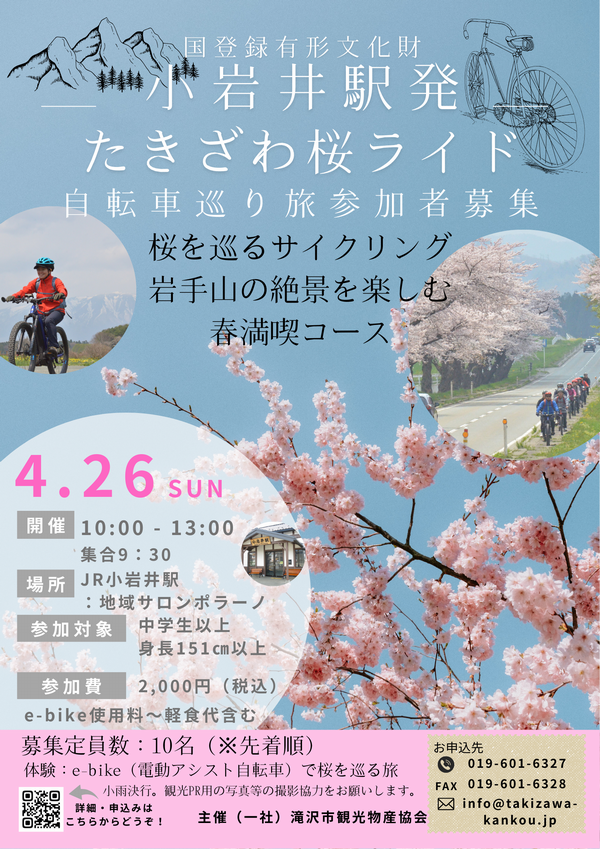 春の滝沢を自転車で巡りませんか?昨年、国登録有形文化財に登録されたJR小岩井駅を出発し、満開の桜並木や岩手山の雄大な景色を楽しむサイクリングイベント「たきざわ桜ライド」を今年も開催いたします!e-bike(電動アシスト自転車)を使用するため、体力に自信がない方でも安心してご参加いただけます。春風を感じながら、桜と自然の絶景を満喫する特別なひとときをお届けいたします。