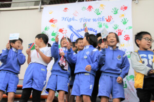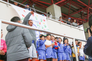 選手たちは時折小雨の降る中での公開練習では、冷たい雨にも負けないようなぶつかり合いを見せていました。子どもたちも観客席から手旗を振りながら大きな声でナミビア代表の応援を行いました。