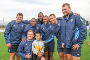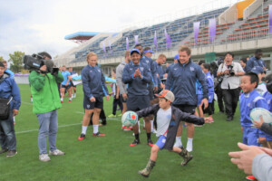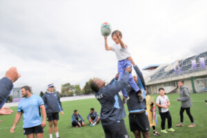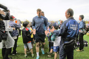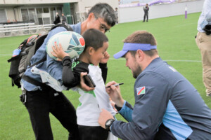 練習後には選手と子供たちとの交流会も行われ、選手からサインをもらったり、ラグビーボールのパスを体験したり、選手と写真撮影をして交流をしました。